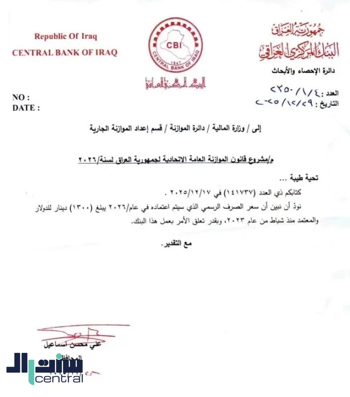 وجاء في المخاطبة ما نصه "نود أن نبين أن سعر الصرف الرسمي الذي سيتم اعتمادي في عام 2026 يبلغ 1300 دينار والمعتمد منذ شباط عام 2023 وبقدر تعلق الامر بعمل هذا البنك".