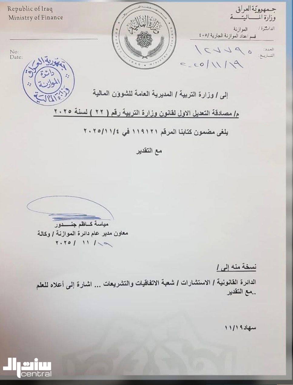 ووفقا لكتاب رسمي صادر عن الوزارة، ومُذيل بتوقيع معاون مدير عام دائرة الموازنة وكالة مياسة كاظم جندور بتاريخ 19 من شهر تشرين الثاني/نوفمبر الجاري، فقد تقرر: إلغاء مضمون الكتاب المرقم (119121) بتاريخ 2025/11/4، والمتعلق بنص المادة (4/ثالثاً) من قانون التعديل الاول لقانون وزارة التربية رقم (22) لسنة 2011.