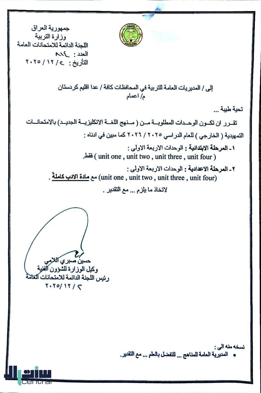 وقالت الوزارة في بيان ان "اللجنة الدائمة للامتحانات العامة تقرر ان تكون الوحدات المطلوبة من ( منهج اللغة الإنكليزية الجديد في الامتحانات التمهيدية (الخارجي) للعام الدراسي 2025 / 2026، هي: الوحدات الأربعة الأولى فقط للمرحلة الابتدائية والوحدات الأربعة الأولى مع مادة الأدب كاملة بالنسبة للمرحلة الإعدادية، وكما موضح في الأدنى:-