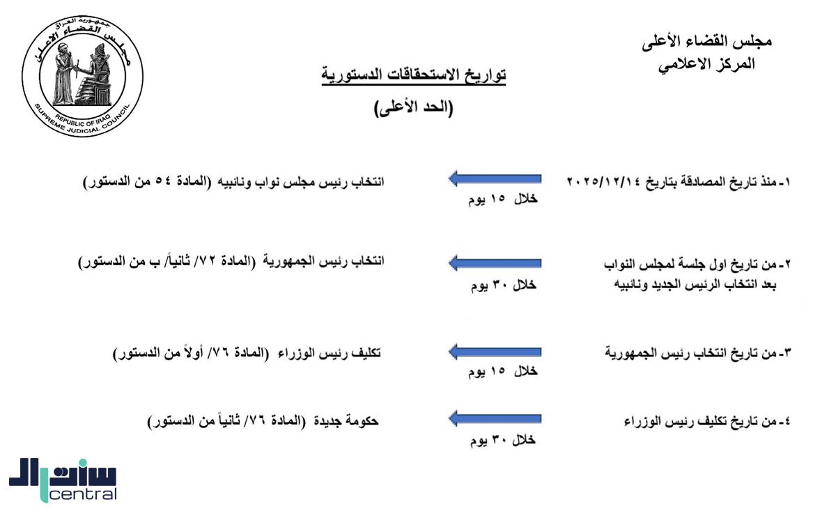 نشر مجلس القضاء الأعلى، اليوم الاحد، تواريخ الاستحقاقات الدستورية ومدد اختيار الرئاسات الثلاث وتشكيل الحكومة.