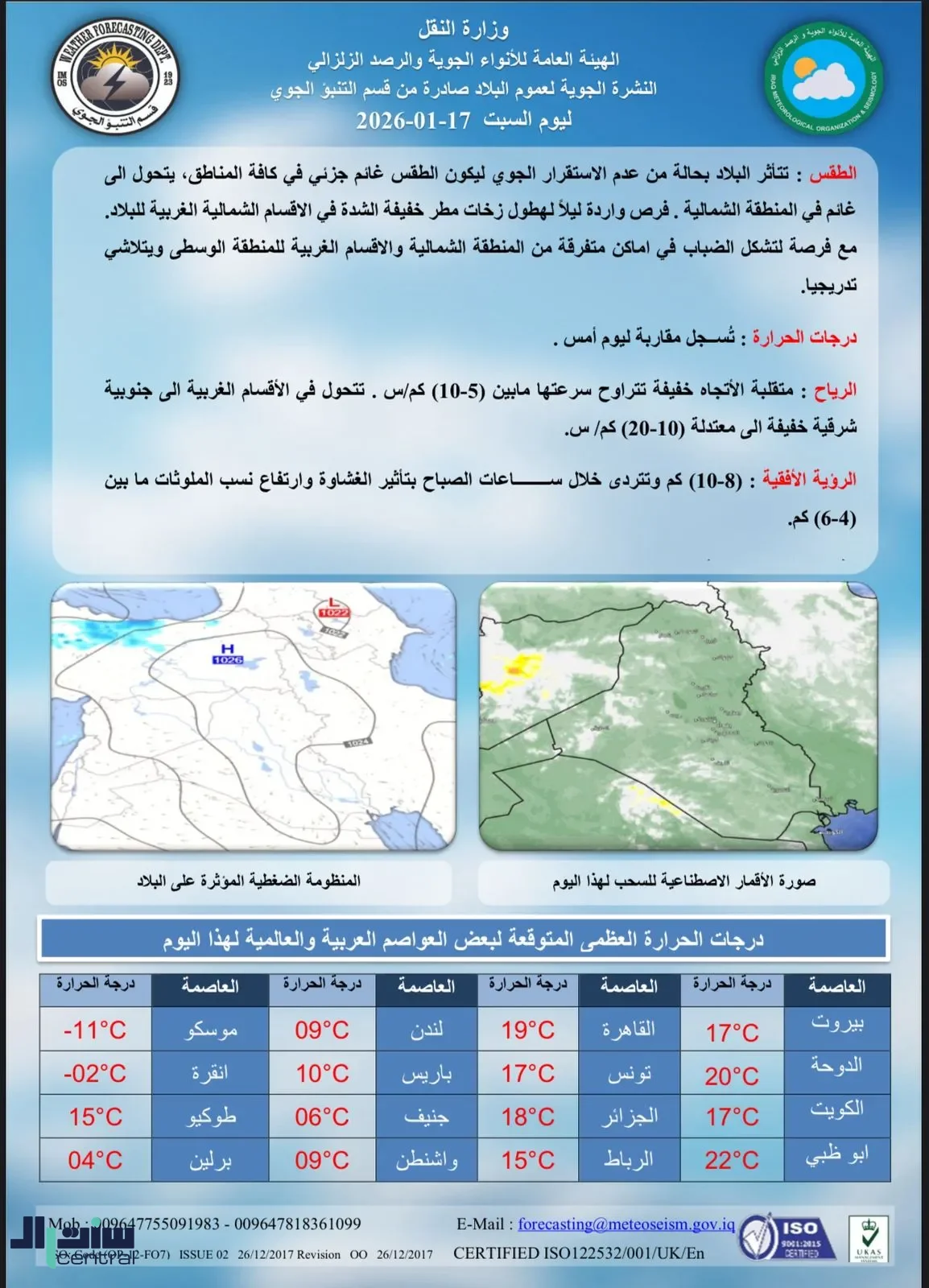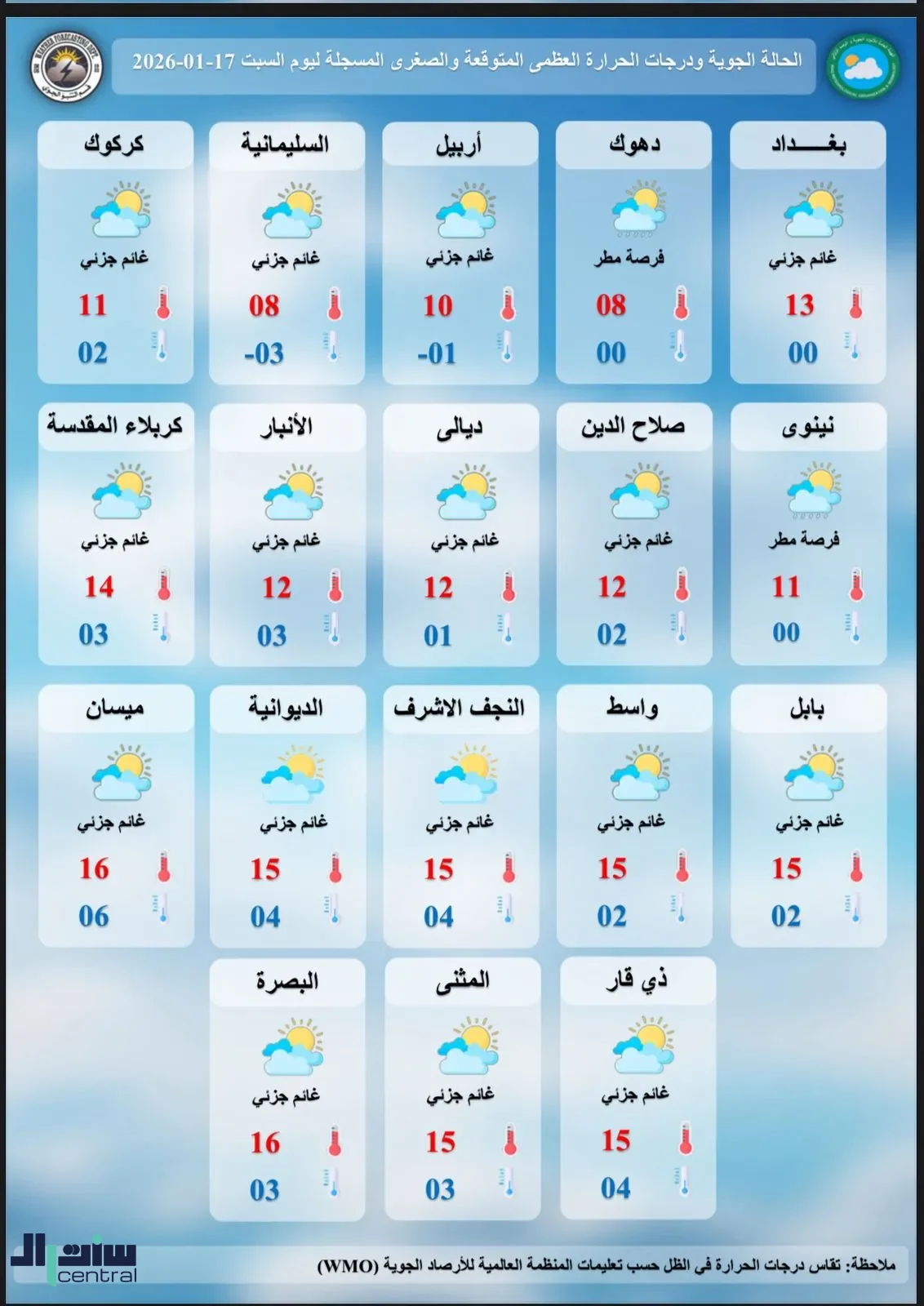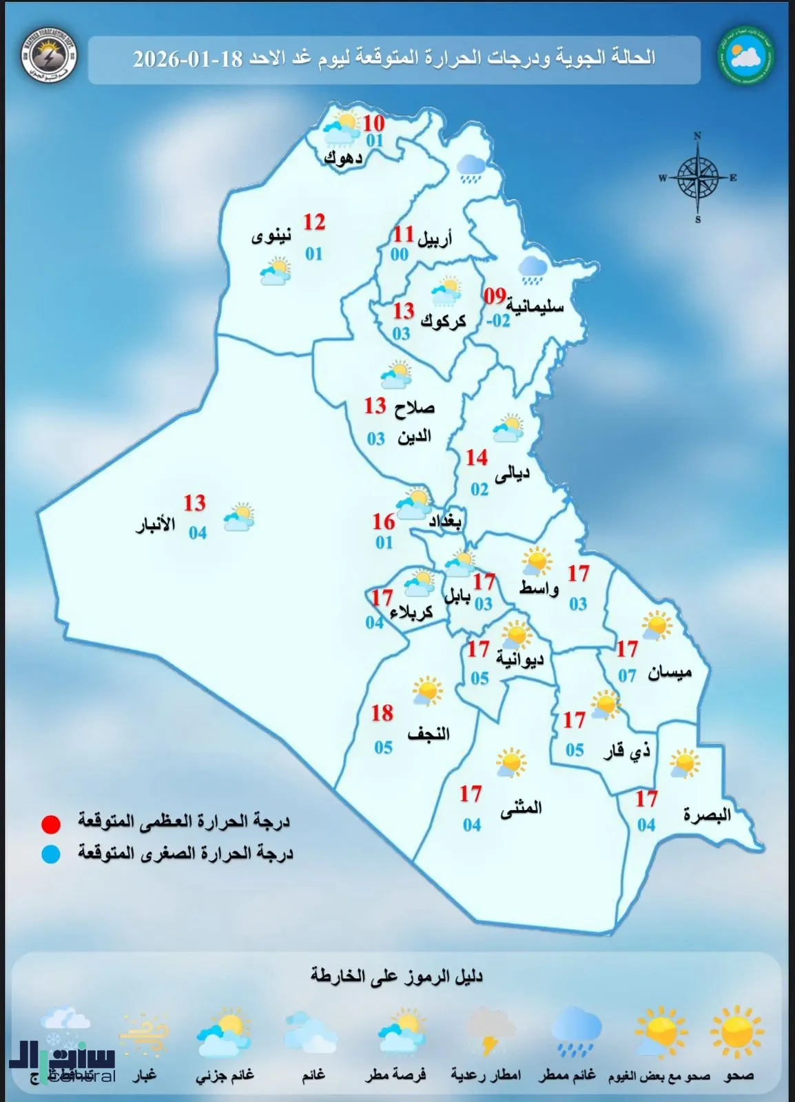 أعلنت هيئة الأنواء الجوية، اليوم السبت، حالة طقس العراق خلال الأيام المقبلة.