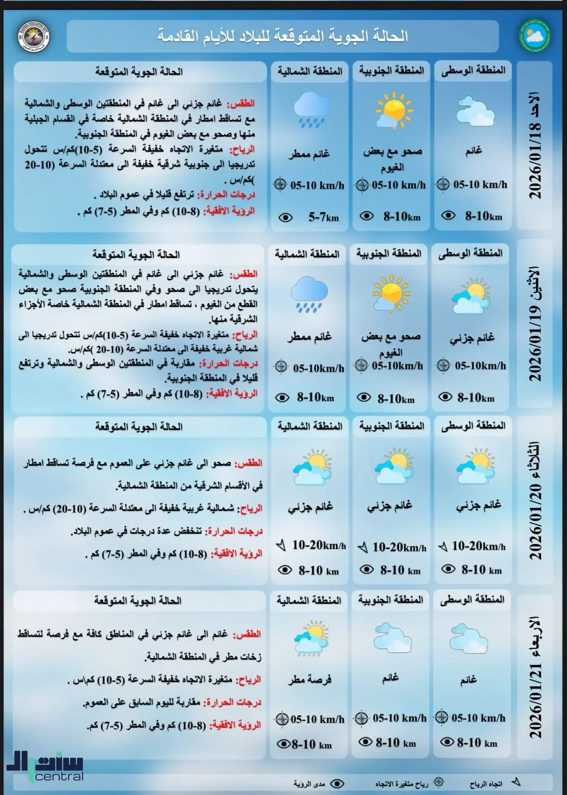 وتوقعت الهيئة في بيان ورد لـ"سنترال"، "هطول أمطار وثلوج وانخفاض في درجات الحرارة".