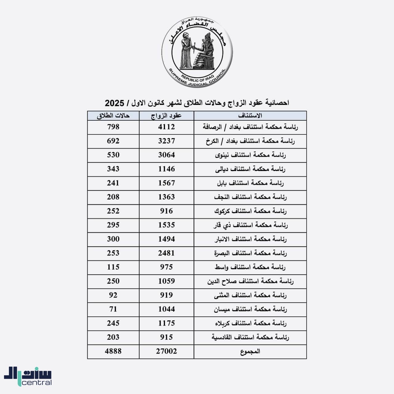 وذكر بيان للمجلس، ورد لـ"سنترال"، أن "مجموع عقود الزواج لشهر كانون الأول الماضي بلغ 27002، في حين بلغت حالات الطلاق 4888 حالة، في جميع محافظات العراق باستثناء إقليم كردستان".