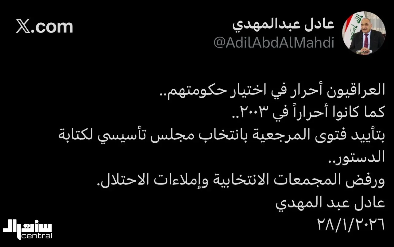 وقال عبد المهدي، عبر منصة (إكس): "العراقيون أحرار في اختيار حكومتهم.. كما كانوا أحراراً في 2003، بتأييد فتوى المرجعية بانتخاب مجلس تأسيسي لكتابة الدستور ورفض المجمعات الانتخابية وإملاءات الاحتلال".